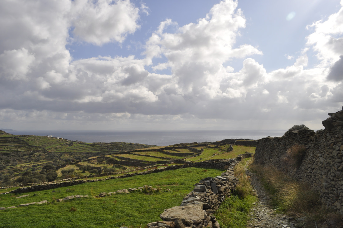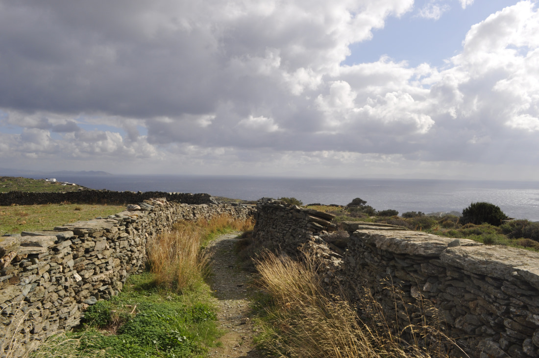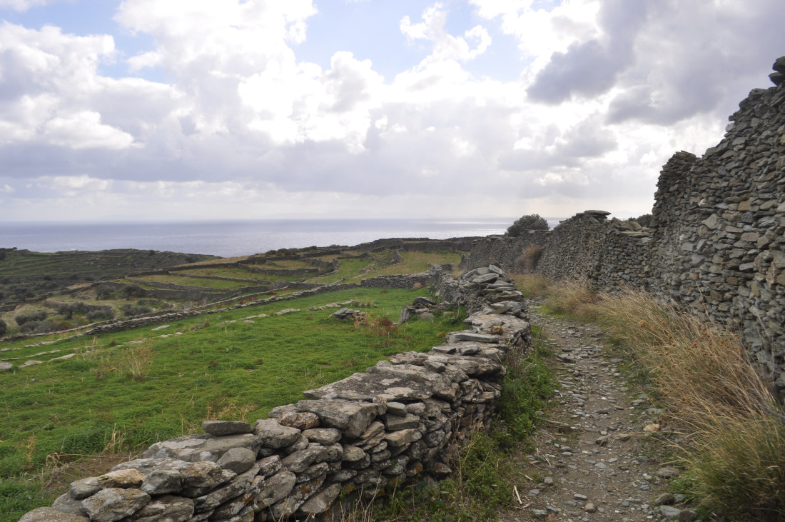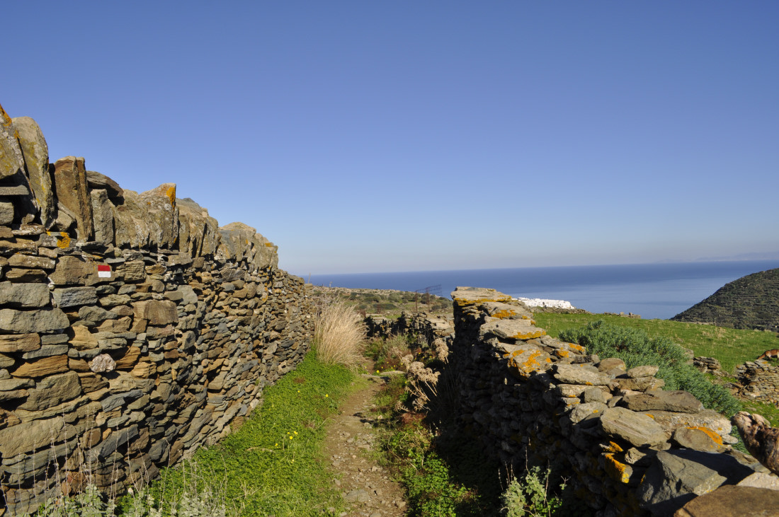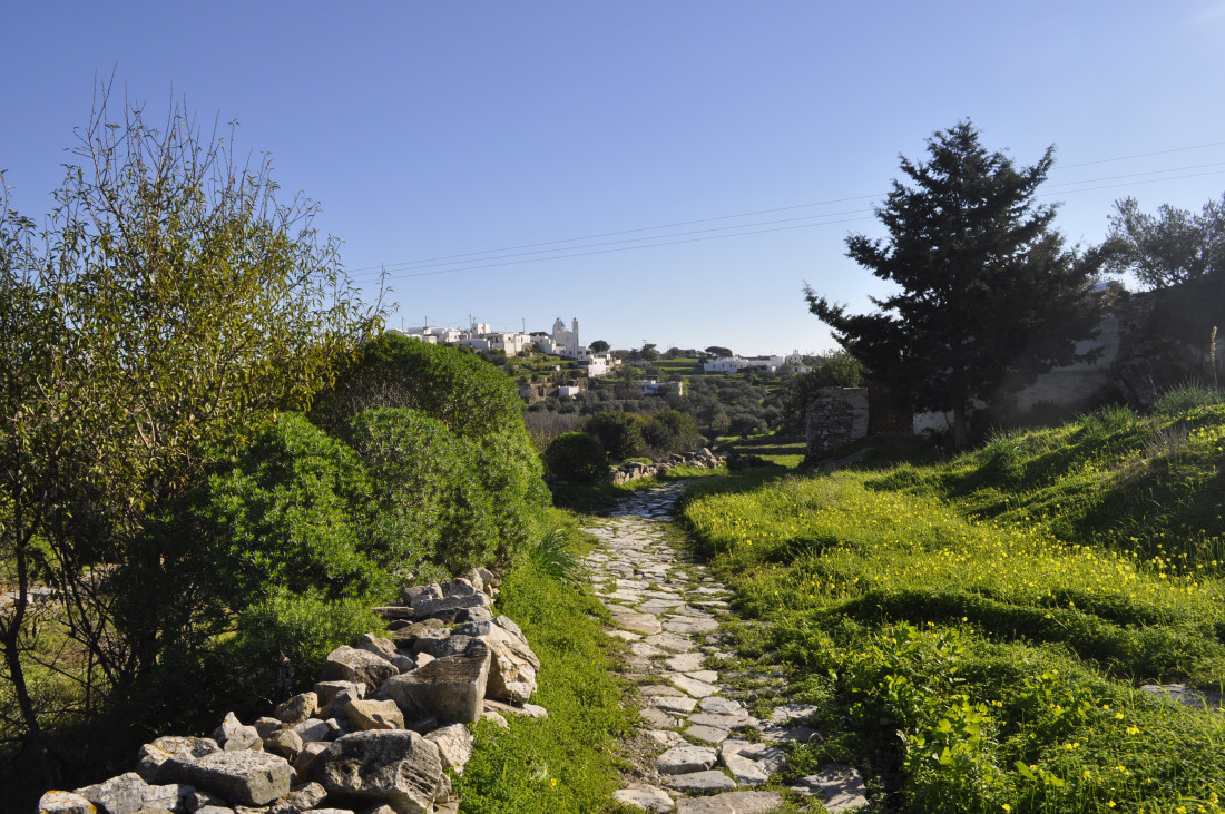 Le sentier part d’Apollonia. A travers un large chemin pavé, on arrive à Kato Pétali. Autrefois, ce sentier était la connexion principale entre les deux villages. Depuis Kato Pétali, le chemin continu entre des champs et des terrasses cultivées. Plus loin, on passe devant l’église de Panagia Straopodi. Ce nom original dérive très probablement du mot « Tragopodaros » (pieds de chèvre) devenu « Straopodi » (pieds tordus) qui était l’appellation populaire du dieu Pan. Il y a quelques siècles, sur un des murs de cette église était bâti une statue du dieu Pan. Environ un kilomètre plus loin, le sentier aboutit au Monastère de Vryssi (16e siècle). Au sein du Monastère y fonctionne un musée d’art ecclésiastique.