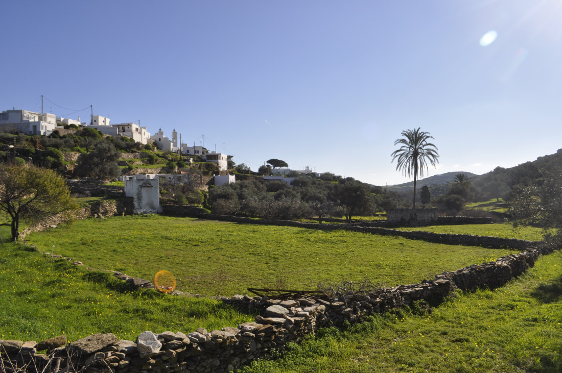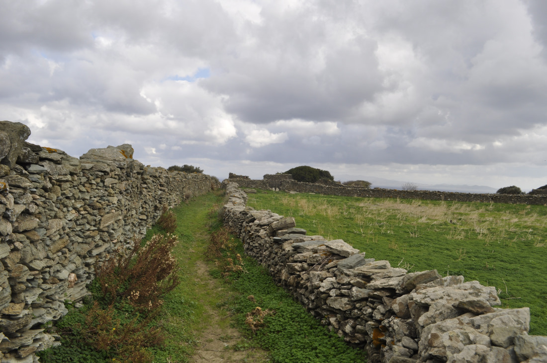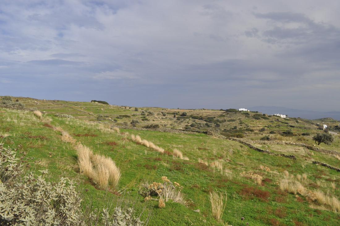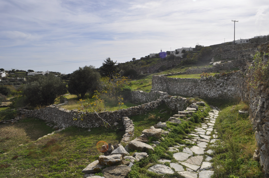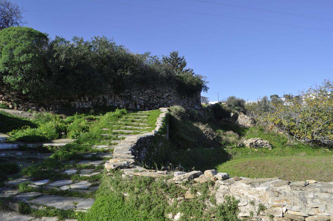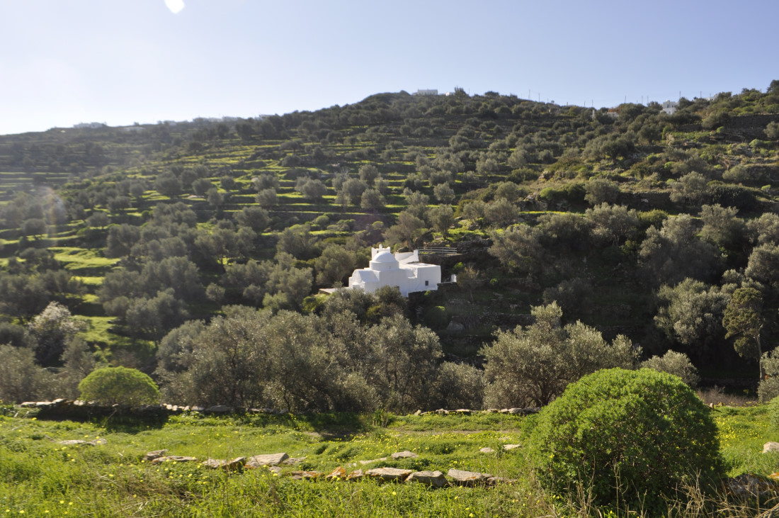 En laissant le Monastère, le sentier de nouveau avance en méandres entre des terrasses et des oliveraies. A un certain moment, le passage se fait sur la route principale (environ 300m.) et il faut faire très attention en traversant. De nouveau sur un vieux sentier qui descend gentiment dans une belle petite gorge. A la fin de la gorge, l’endroit s’appelle Vryssiana. De là, près du moulin à eau ruiné, débutent des petits canaux d’irrigation pour tous les champs de Platys Gialos. A Platys Gialos, le village situé à la fin du sentier, se trouve une des plages les plus longues des Cyclades. Dans le passé, c’était un important centre de production de céramiques.